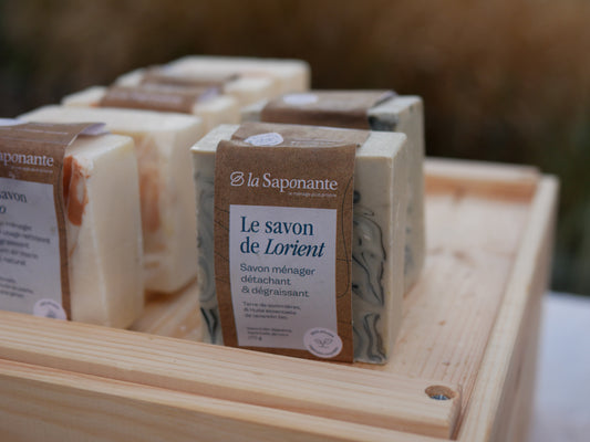 Notre gamme de savons ménagers solides est fabriquée en Bretagne à Lorient et développée pour nettoyer et dégraisser toute la maison de la cuisine à la salle de bain : vaisselle, surfaces, sols et même détacher le linge.