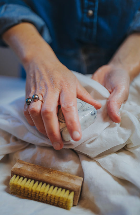 Humidifiez plutôt votre éponge, brosse ou le tissu à détacher , puis frottez le savon dessus.